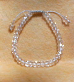これは、カット水晶にシルバーの紐で作ったお手製のブレスレットです。紐を平結びにして止め具のかわりにしています。今までは、ワイヤーやゴムでブレスレットを作る事が多かったのですが、アジアンノットにハマっていて、そのために石を沢山ゲットしたのですが、石の穴が小さいものが多く(糸の太さは1mm)糸が通らないものがけっこうあって…結局は、ワイヤーのお世話になるしかなさそうです。