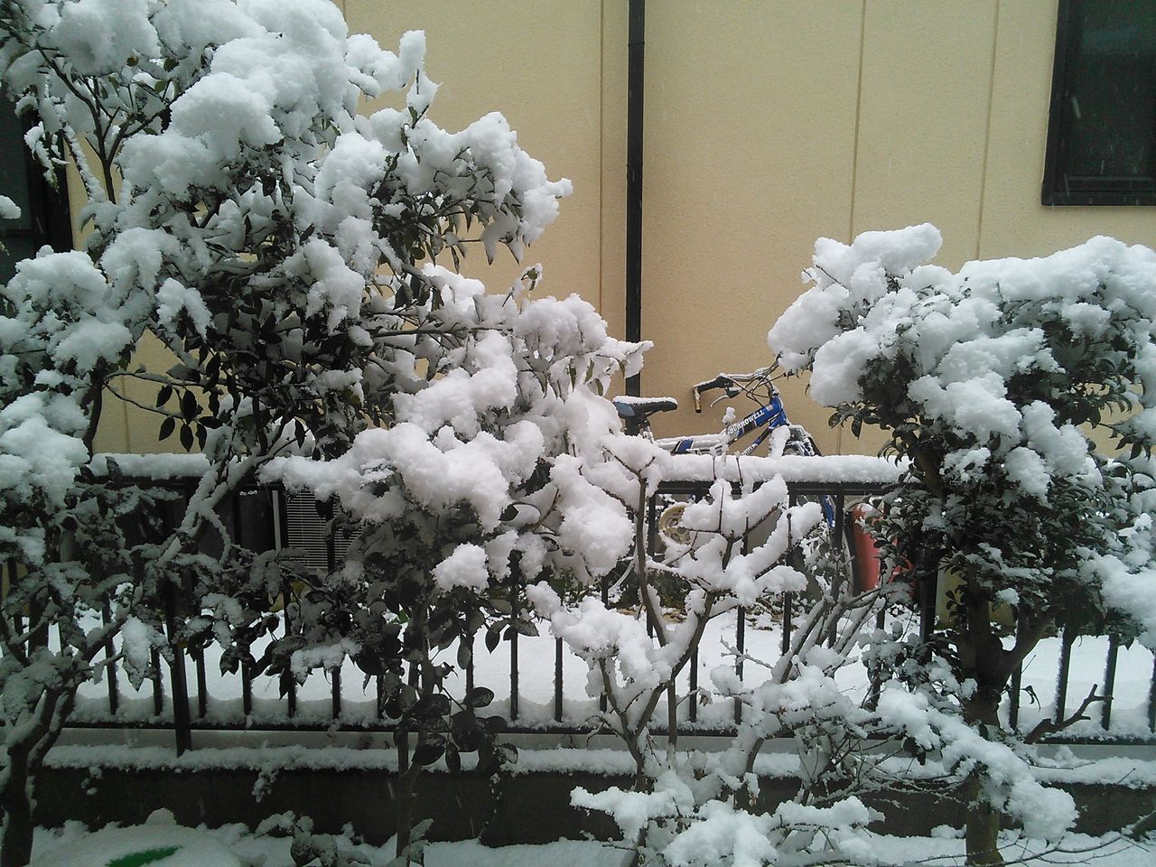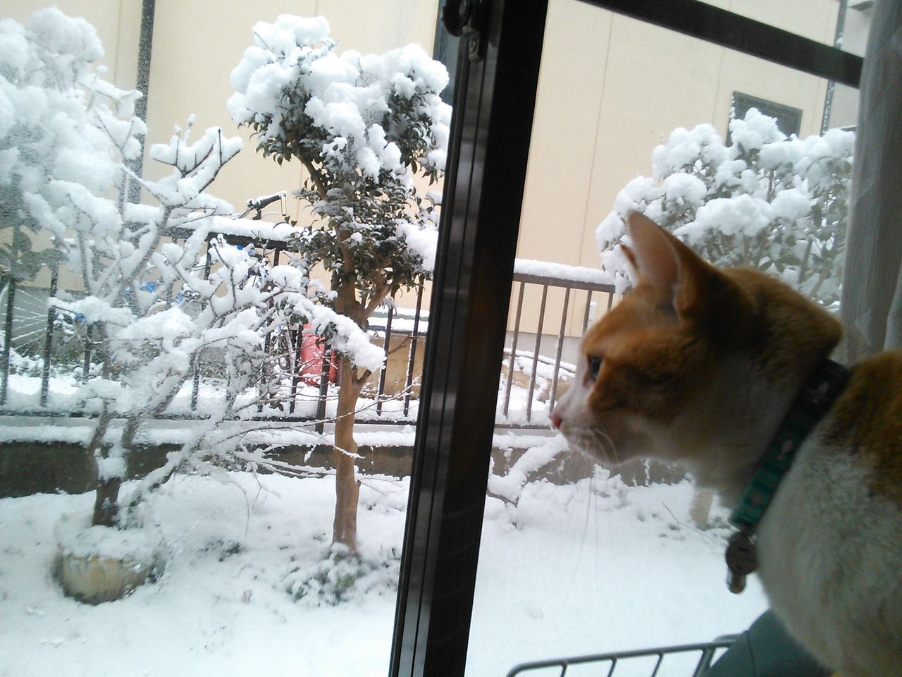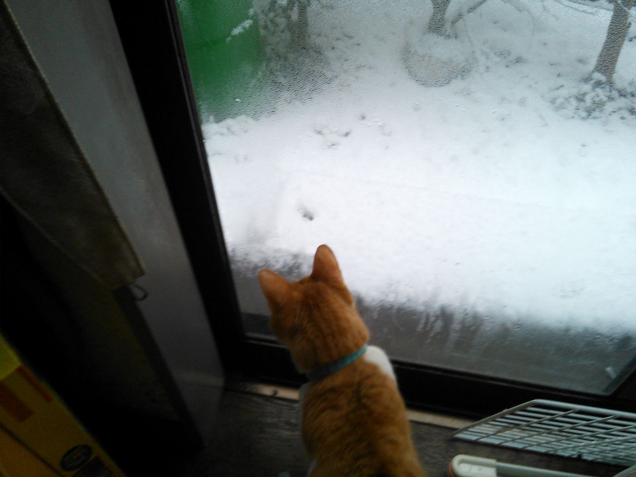 チビは暖かい部屋から雪を不思議そうに見ています。